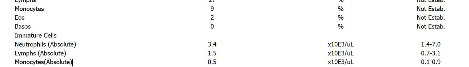 • Monocytes absolute: 0.50 \times 10^3/\mu L = 0.50 \times 10^9/L