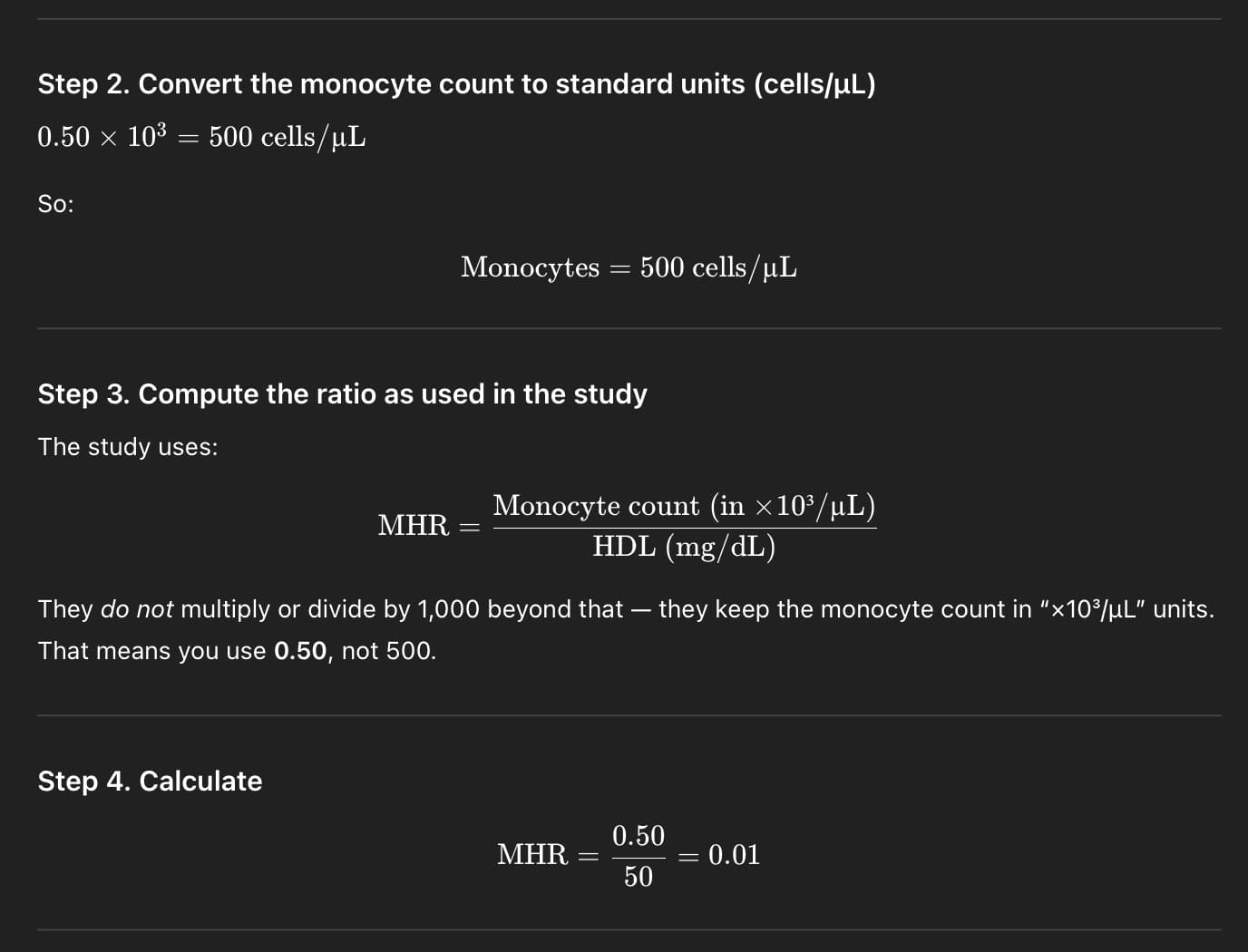Answer: MHR ≈ 0.418 (unitless ratio, using monocytes in ×10³/µL and HDL in mmol/L).
