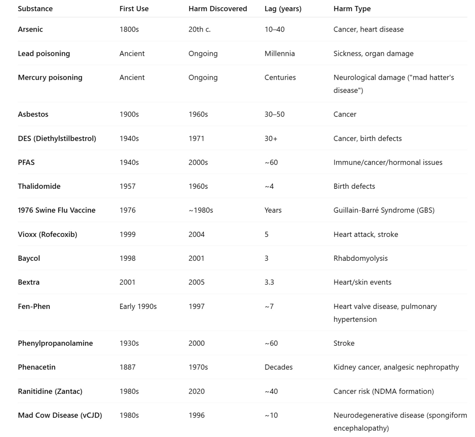 "Delayed negative consequences, especially from pharmaceuticals and chemicals, highlight the importance of vigilant long-term monitoring and post-marketing research to uncover risks that may only emerge after years of widespread use and exposure."